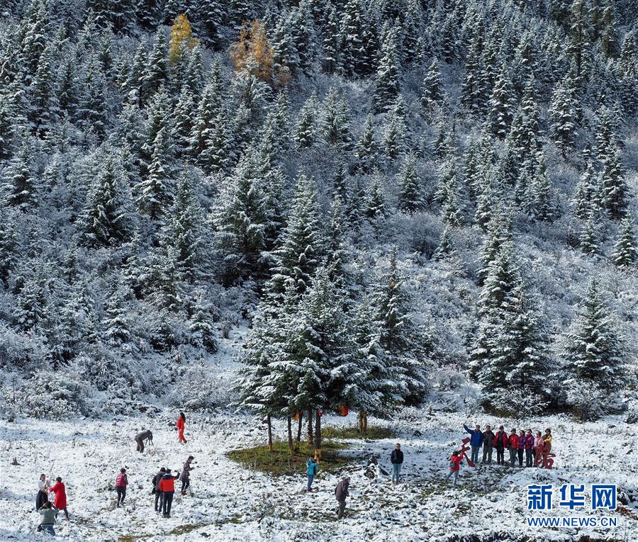 10月17日,在川藏線高爾寺山至理塘路段,部分游客在一個路邊觀景臺附近拍照留念。當(dāng)日,一場夜雪后,川藏線高爾寺山至理塘路段披上了一層銀裝。雪山、牦牛、云朵、松林,帶來了濃濃的雪域風(fēng)情。 新華社記者 王迪 攝