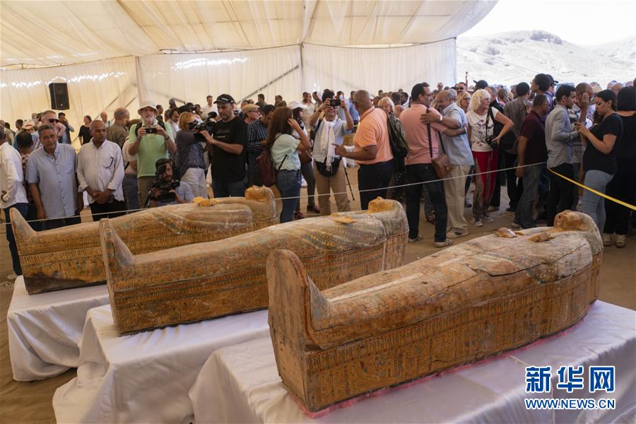 這是10月19日在埃及盧克索拍攝的近期發(fā)掘出的棺槨。 埃及文物部19日在南部城市盧克索舉行的新聞發(fā)布會上宣布,埃及考古隊(duì)近期發(fā)掘出30具3000年前的木質(zhì)棺槨。 新華社記者 李碧念 攝