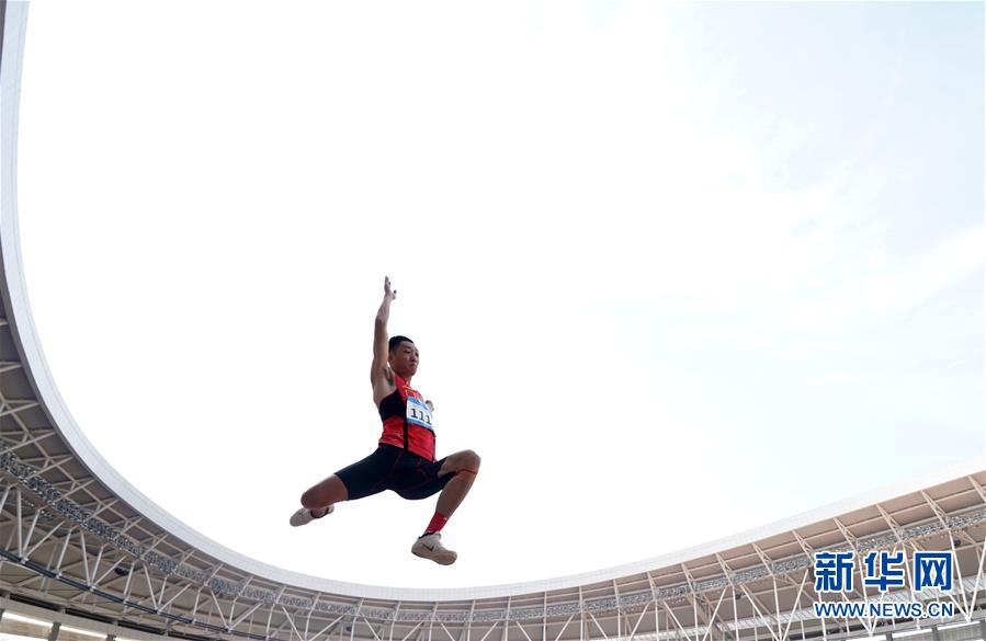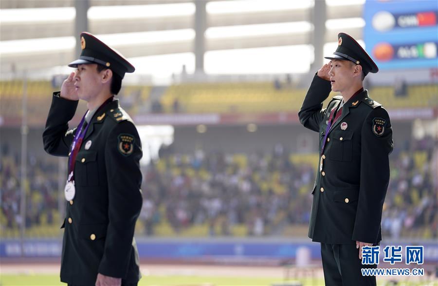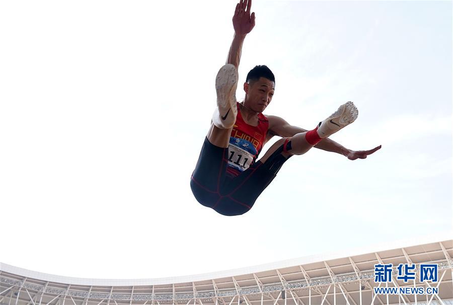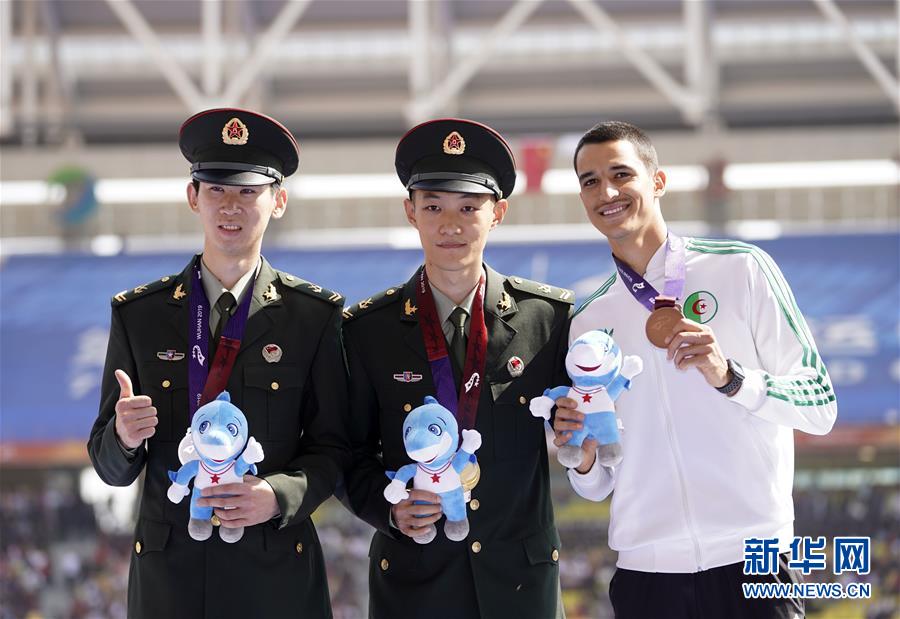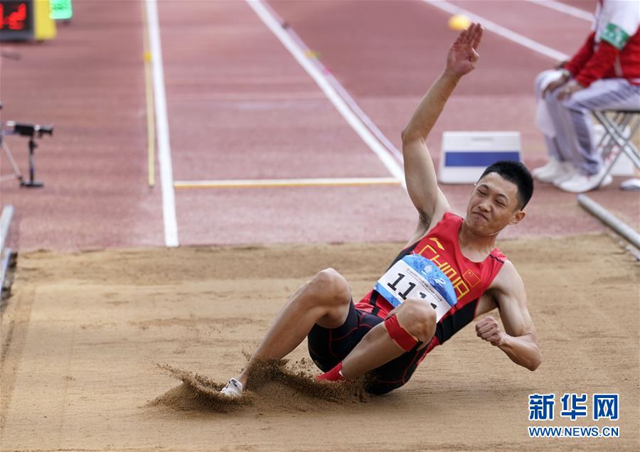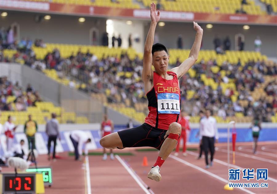 10月24日,中國選手王嘉男在比賽后慶祝。 當(dāng)日,在武漢舉行的第七屆世界軍人運(yùn)動會田徑項(xiàng)目男子跳遠(yuǎn)決賽中,中國選手王嘉男、黃常洲分別以8米15和8米12的成績獲得冠亞軍。 新華社記者金良快攝
