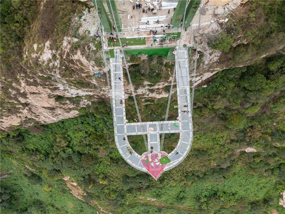 2019年9月20日,從落差198米懸崖上伸出周長60米懸空的“高空玻璃懸廊”在河南南陽七峰山落成,該玻璃懸廊名為“云頂之心”。