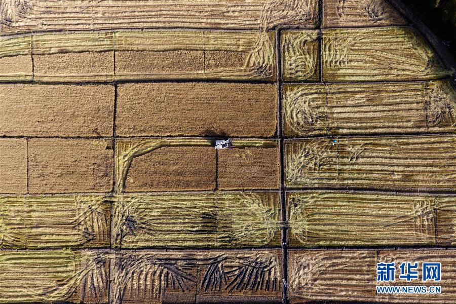 在太原市晉源區(qū)赤橋村,收割機(jī)在稻田里作業(yè)(10月28日無(wú)人機(jī)拍攝)。