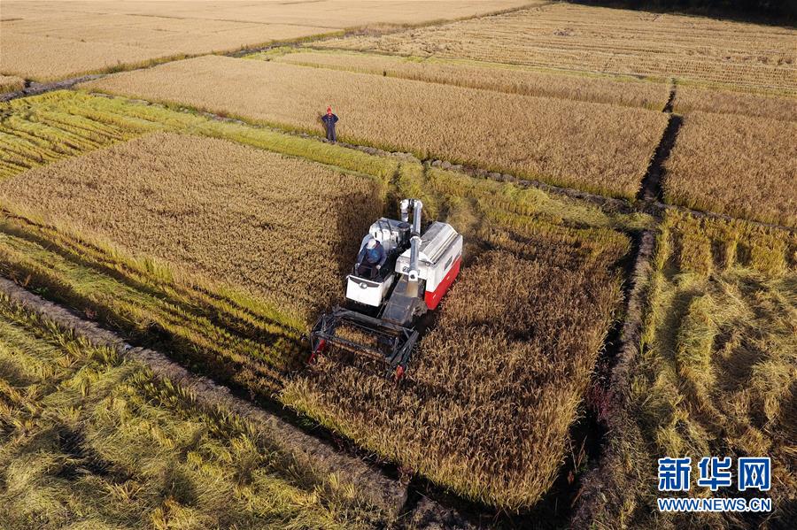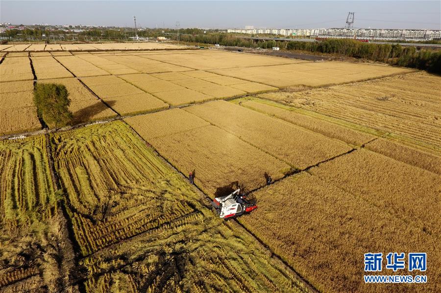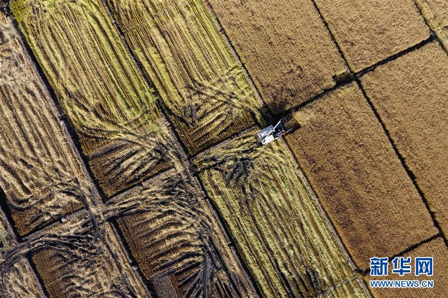 收割機(jī)在太原市晉源區(qū)赤橋村稻田里作業(yè)(10月28日無人機(jī)拍攝)。新華社記者詹彥攝
