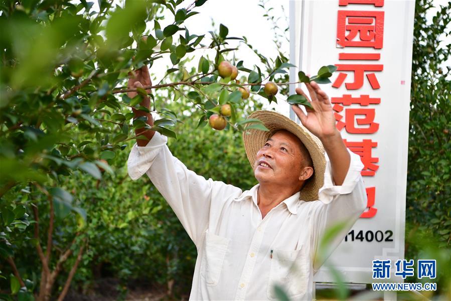 在河南省信陽市光山縣槐店鄉(xiāng),農(nóng)民在聯(lián)興油茶基地查看油茶果生長狀況(9月4日攝)。新華社記者馮大鵬攝