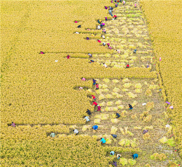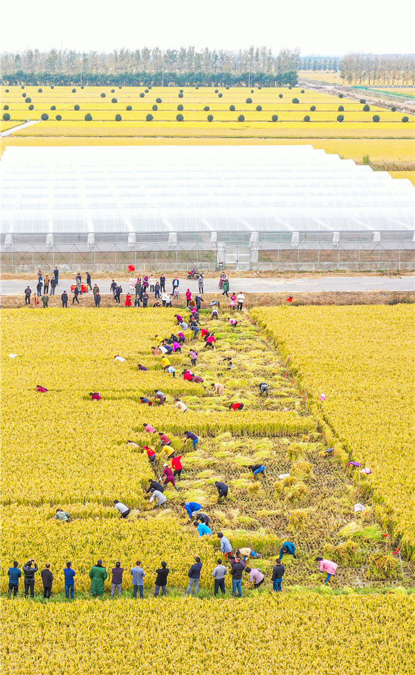 2019年10月26日,江蘇省宿遷市泗洪縣在稻米小鎮(zhèn)石集鄉(xiāng)舉行具有地方特色的割稻比賽,近60名選手在金色稻田揮舞銀鐮、緊張角逐。張連華/視覺中國