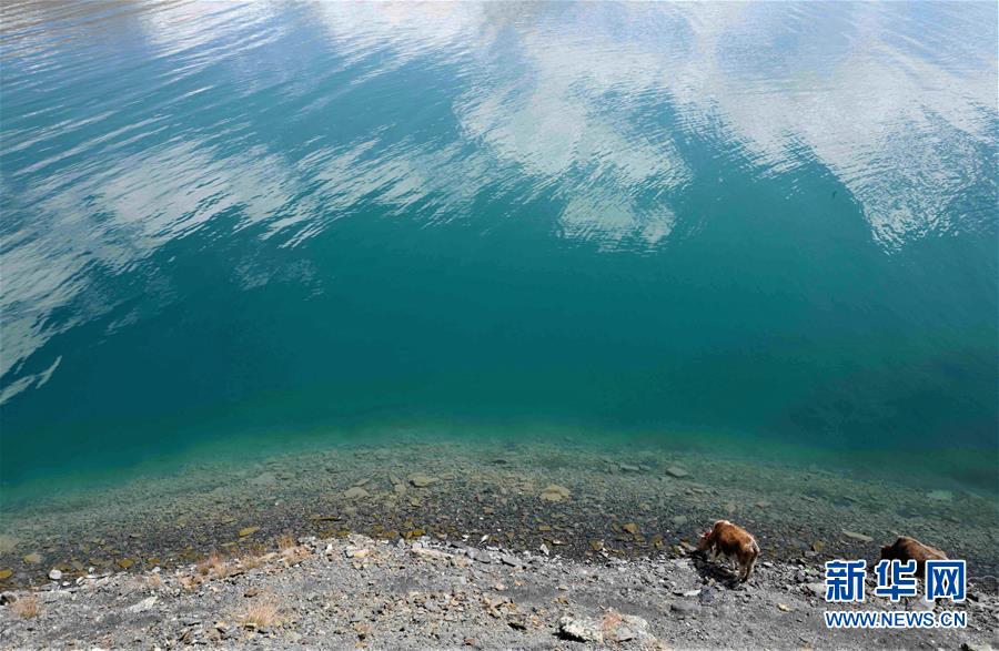 兩頭牛在西藏羊湖邊喝水(5月24日攝)。