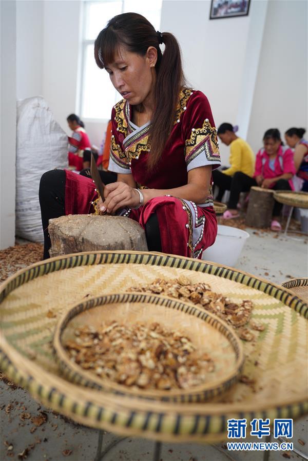 在大興地鎮(zhèn)維拉壩“珠海小區(qū)”內(nèi)的農(nóng)產(chǎn)品加工扶貧車(chē)間,村民李南珍在剝核桃仁(6月24日攝)。新華社記者秦晴攝