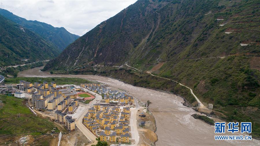 建于怒江邊的大興地鎮(zhèn)維拉壩“珠海小區(qū)”內(nèi)的學(xué)校和住房已初現(xiàn)規(guī)模(6月24日無(wú)人機(jī)拍攝)。新華社記者胡超攝