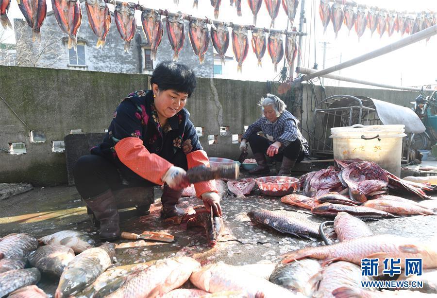 3月12日,浙江省湖州市吳興高新區(qū)幻溇村村民在剖魚(yú)準(zhǔn)備腌制魚(yú)干。近日,太湖南岸湖州地區(qū)久雨初晴,漁民忙著制作、晾曬魚(yú)干。新華社記者翁忻旸攝