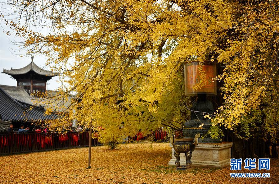 11月11日,人們?cè)诖笥X寺內(nèi)觀賞古銀杏樹。新華社記者尹棟遜攝