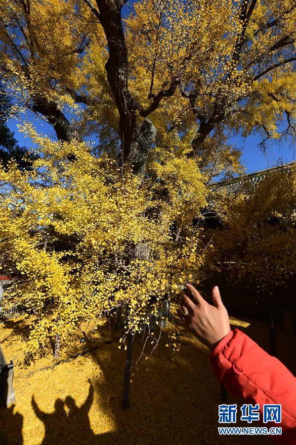 11月11日,人們?cè)诖笥X寺內(nèi)的古銀杏樹旁留影。新華社記者尹棟遜攝