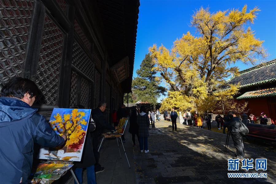 11月11日,繪畫(huà)愛(ài)好者在大覺(jué)寺內(nèi)的古銀杏樹(shù)旁寫(xiě)生。新華社記者尹棟遜攝