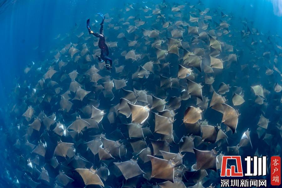 2019年5月31日?qǐng)?bào)道(圖片拍攝于4月23日),環(huán)?;顒?dòng)家兼潛水教練Jay Clue上個(gè)月在墨西哥下加利福尼亞州洛斯卡沃斯附近海岸,幸運(yùn)地邂逅了一支蝠鲼遷徙大軍,數(shù)百只蝠鲼浩浩蕩蕩在海水中行進(jìn),畫(huà)面十分震撼。