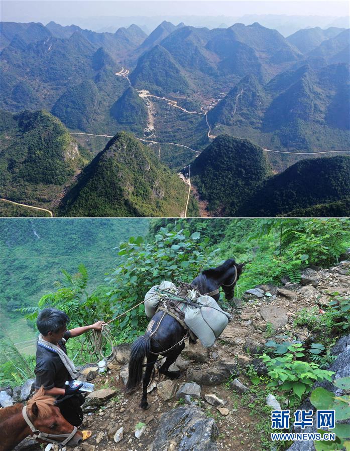 拼版照片:上圖為已經修通公路的大化瑤族自治縣板升鄉(xiāng)弄勇村弄為屯以及周邊村屯(11月11日無人機拍攝);下圖為在弄勇村弄為屯,村民用馬將建筑材料馱回家,用于修建新房(2014年6月18日攝)。