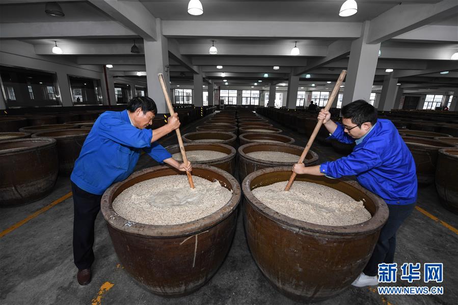 2019年11月13日,江蘇省如皋市白蒲鎮(zhèn)一釀酒廠,工人在進行二次喂飯工藝操作。