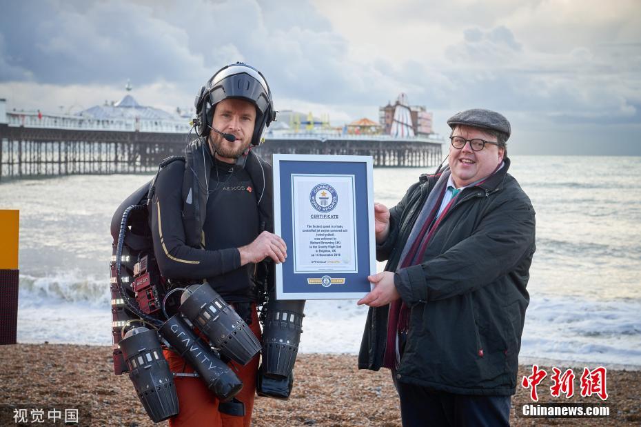 11月18日訊,英國布萊頓,英國發(fā)明家理查德·布朗寧穿著一套由身體控制、噴氣發(fā)動(dòng)機(jī)驅(qū)動(dòng)、風(fēng)力導(dǎo)向的飛行服,以高達(dá)每小時(shí)85.06英里(約137公里)的飛行速度,打破了自己創(chuàng)下的噴氣式飛行服速度的吉尼斯世界紀(jì)錄。圖為工作人員為理查德·布朗寧頒獎(jiǎng)。圖片來源:視覺中國