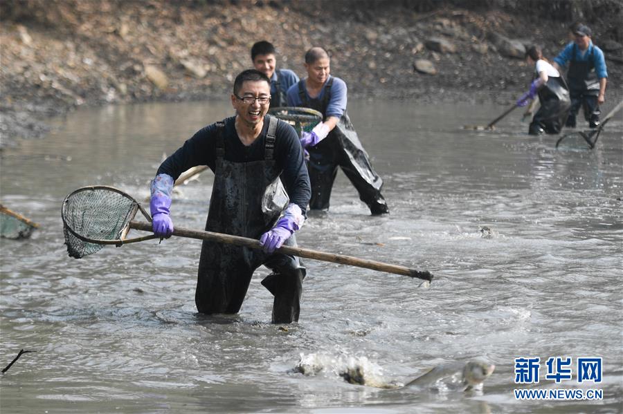 杭州:游客體驗“干塘”捕魚
