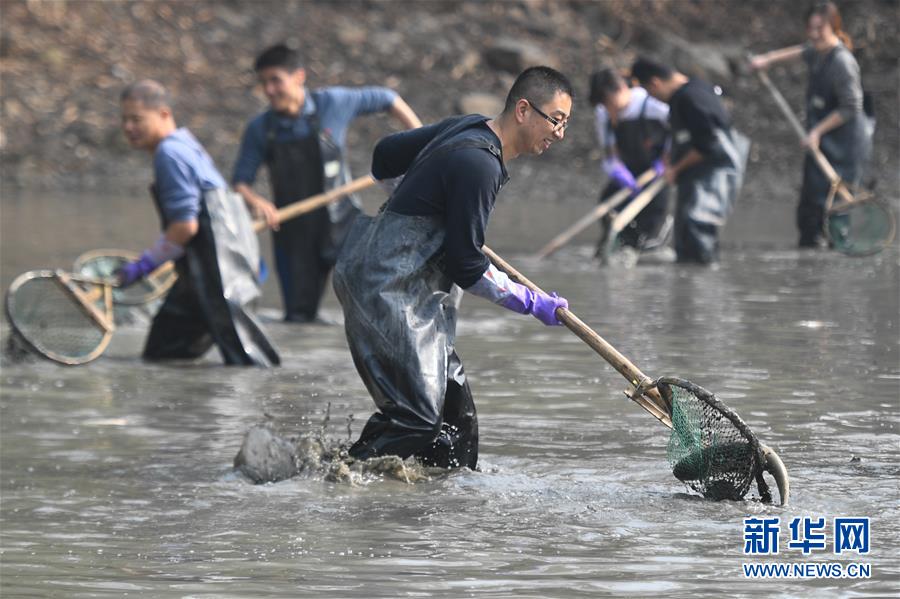 杭州:游客體驗“干塘”捕魚