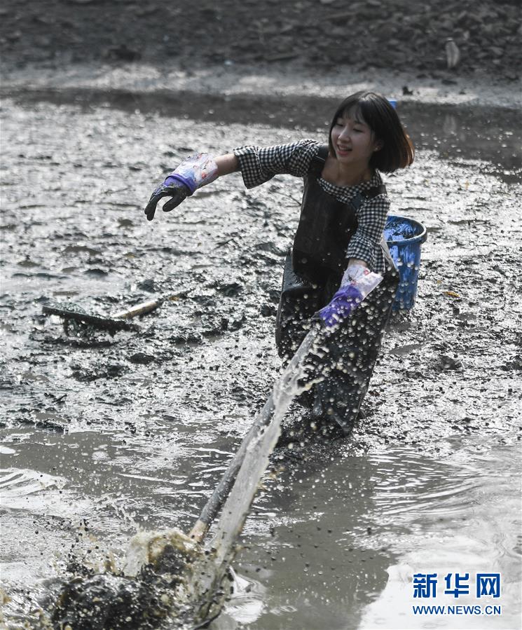 杭州:游客體驗(yàn)“干塘”捕魚