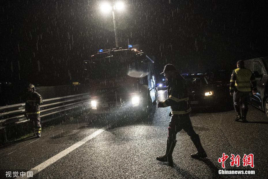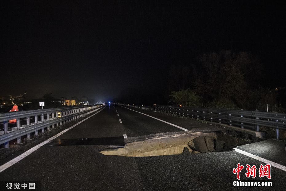 當(dāng)?shù)貢r間2019年11月24日,意大利Villafranca dAsti,意大利遭受惡劣天氣和持續(xù)多日的暴雨,通往都靈方向的A21高速公路路面出現(xiàn)“大坑”。圖片來源:視覺中國