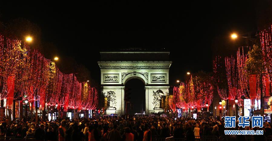 11月24日,在法國巴黎,人們在香榭麗舍大街上參加點燈儀式。當日,法國巴黎香榭麗舍大街點亮彩燈迎圣誕。從即日起至1月8日,整條香榭麗舍大街都將被喜慶的節(jié)日燈飾點亮。新華社記者高靜攝