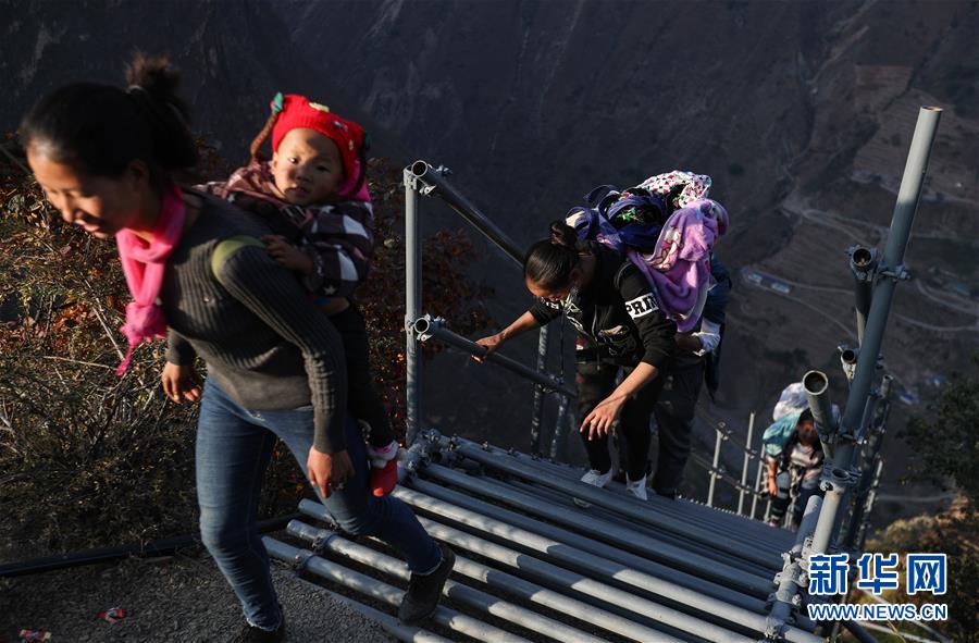 阿土列爾村彝族小伙俄底格哈背著食物攀爬鋼梯(11月24日攝)。新華社記者江宏景攝