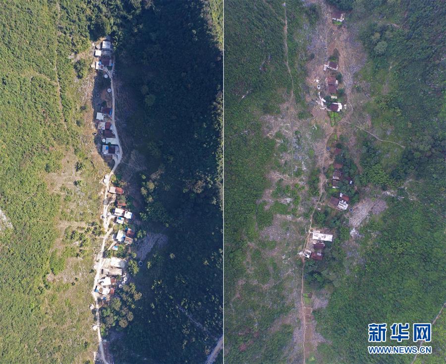 拼版照片:左圖為剛剛修通水泥路的大化瑤族自治縣板升鄉(xiāng)八好村弄研屯(11月11日無(wú)人機(jī)拍攝);右圖為尚未通路的八好村弄研屯(2015年11月3日無(wú)人機(jī)拍攝)。新華社記者黃孝邦攝