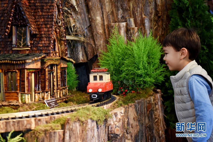 11月26日,在美國紐約植物園節(jié)日小火車展上,兒童觀看托馬斯模型小火車。新華社記者韓芳攝