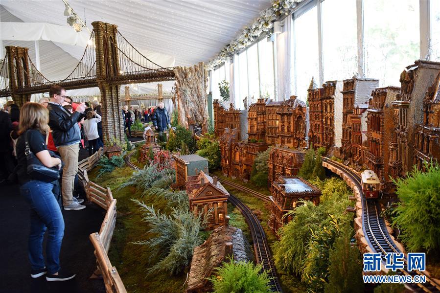 11月26日,在美國紐約植物園節(jié)日小火車展上,游客觀看模型小火車和紐約微縮景觀。新華社記者韓芳攝