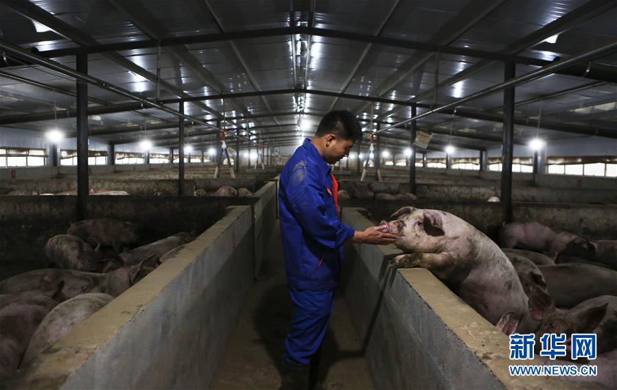 11月28日,在四川省德陽市中江縣一生豬養(yǎng)殖場,工作人員檢查豬的生長情況。