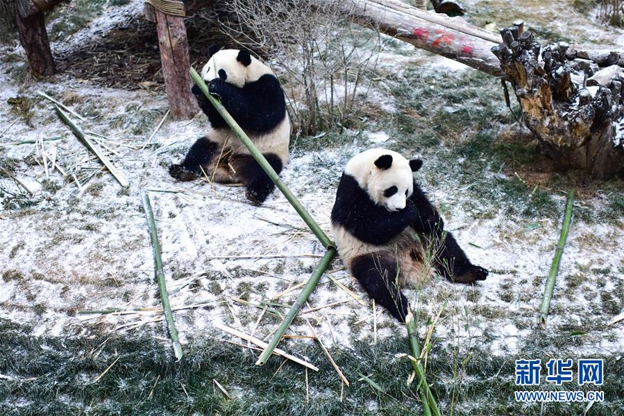 11月29日,在西寧熊貓館內(nèi),兩只大熊貓在吃竹子。 當日,青海省西寧市迎來降雪,西寧熊貓館四只“萌寵”大熊貓在雪天里享受著吃竹子的樂趣。據(jù)了解,大熊貓生活的適宜溫度在26攝氏度至零下5攝氏度之間,冬季氣溫低于零下5攝氏度時,場館會啟用保暖設(shè)施。 新華社記者 吳剛 攝