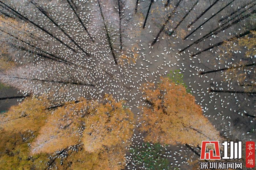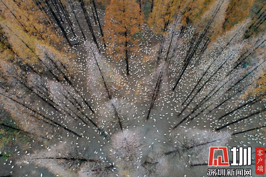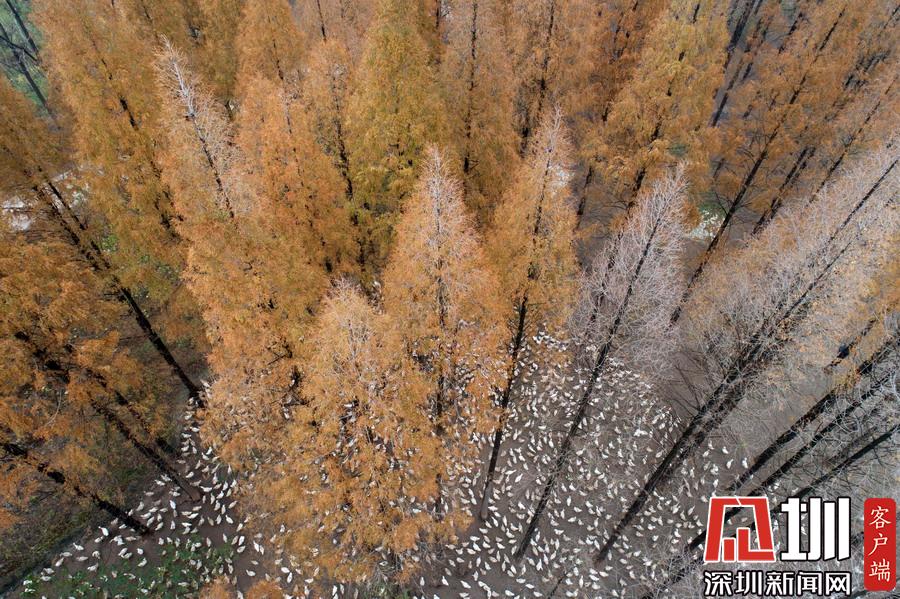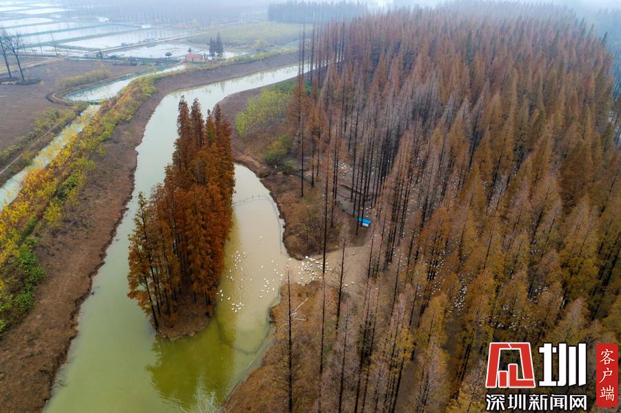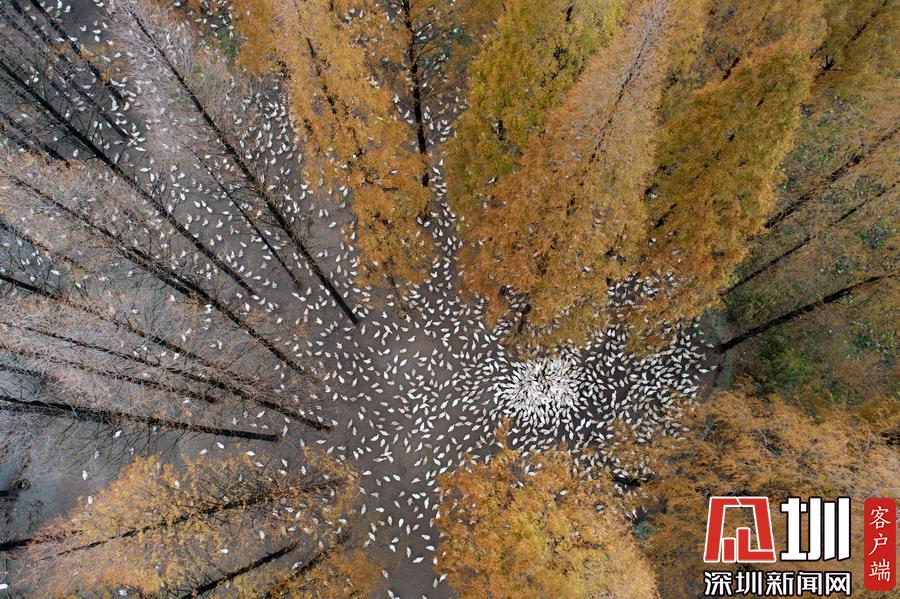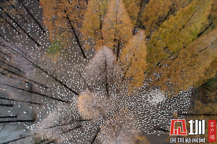 2019年12月1日,江蘇省宿遷市泗洪縣,航拍5000多只四季鵝在陳圩林場的樹林下吃食的壯觀場景。