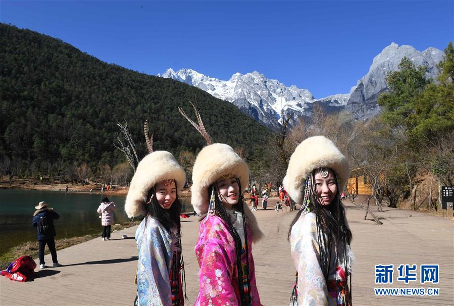 2月14日,游客在麗江玉龍雪山藍月谷留影。
