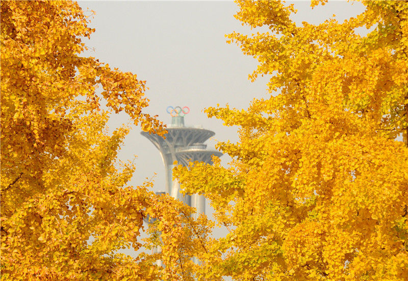 2019年11月1日,北京,深秋時節(jié),奧林匹克公園的銀杏樹一片金黃,與鳥巢、水立方等景觀交相輝映,美不勝收。