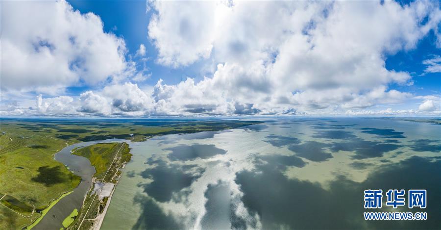 8月28日無人機拍攝的呼倫湖(全景照片)。