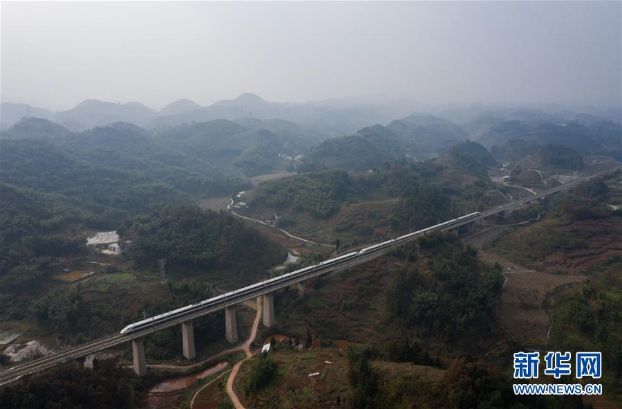 12月16日,一列動車組列車從成貴高鐵鴨池河特大橋上駛過。新華社記者歐東衢攝