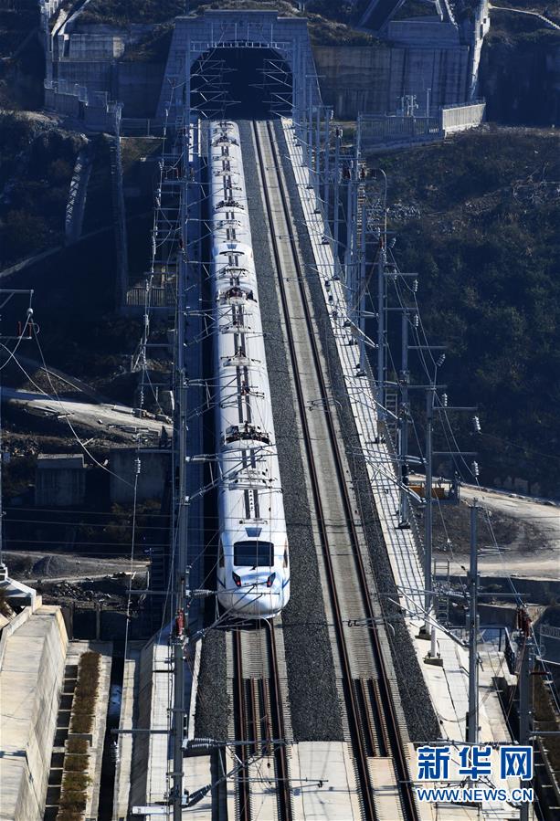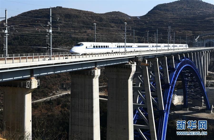 12月2日,一輛試驗列車駛過成貴高鐵鴨池河特大橋。新華社記者劉續(xù)攝