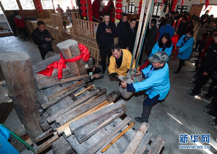 12月15日,工作人員在老油坊內(nèi)通過撞擊的方式將不同尺寸的木楔插入木龍,進(jìn)而榨出茶餅中的茶油。 新華社記者 徐昱 攝