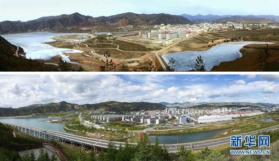 拼版照片:上圖為2009年1月30日拍攝的寧夏固原市隆德縣境內(nèi)的渝河景象;下圖為經(jīng)過流域綜合治理后的渝河(2018年5月19日攝)。  新華社發(fā)(李玉 攝)
