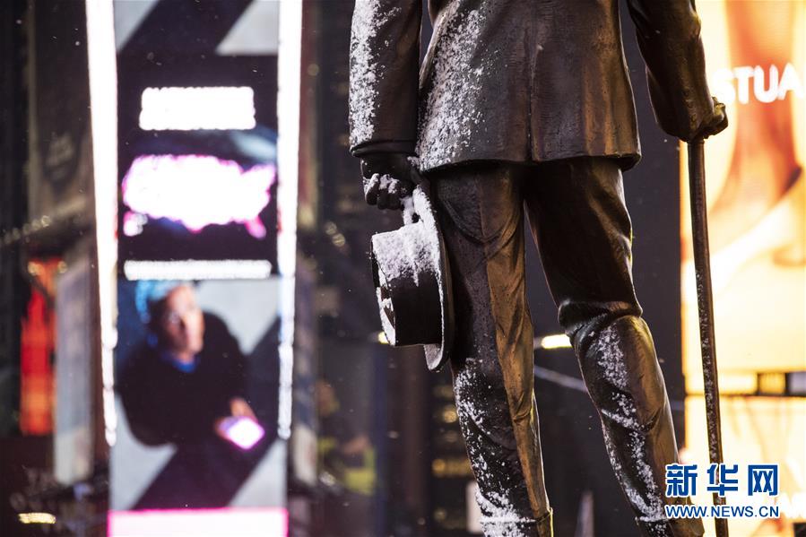 12月18日,美國紐約時(shí)報(bào)廣場上的雕像落上積雪。新華社記者 王迎 攝