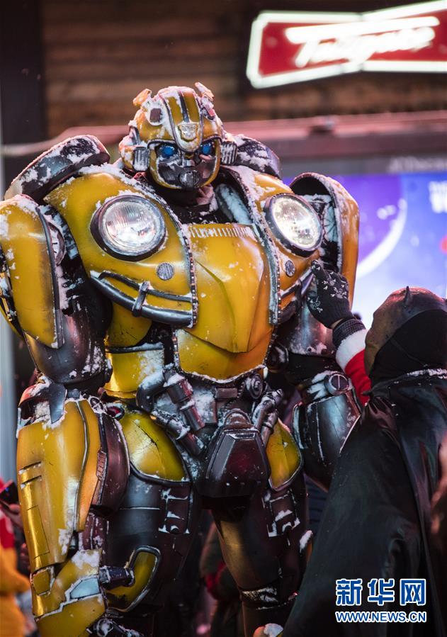 12月18日,在美國紐約時(shí)報(bào)廣場,一名打扮成動(dòng)漫人物的街頭表演者為同伴清理積雪。新華社記者 王迎 攝