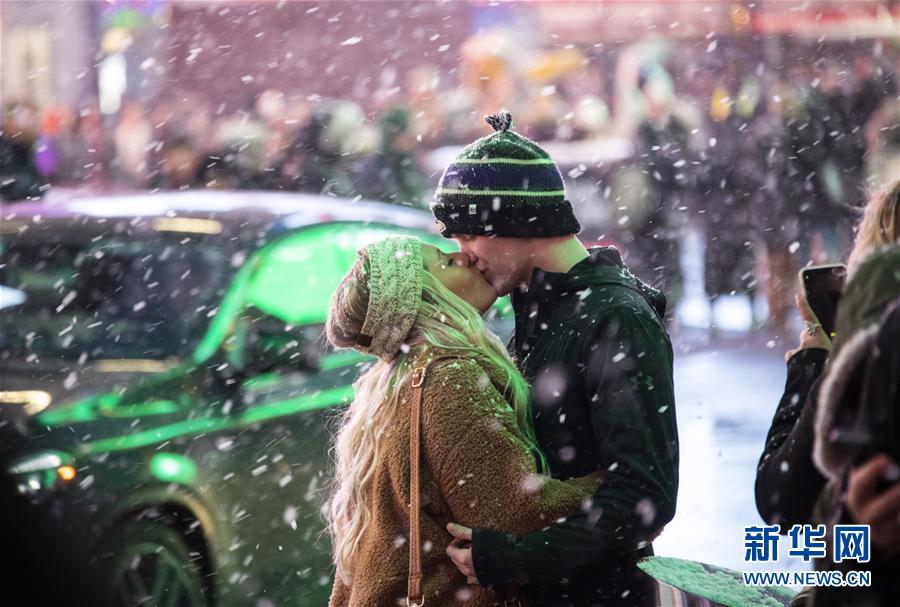 12月18日,在美國紐約時(shí)報(bào)廣場,一對(duì)情侶在雪中擁吻。新華社記者 王迎 攝