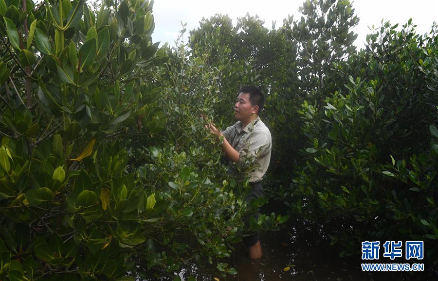 海南東寨港國家級自然保護區(qū)林業(yè)工程師馮爾輝在保護區(qū)內的灘涂上查看紅樹林(12月18日攝)。 馮爾輝2009年大學畢業(yè)后來到保護區(qū)工作,小時候他家就住在紅樹林邊上,他從小和紅樹林打交道,喜歡動植物和鳥類。外貿專業(yè)畢業(yè)的他邊工作邊學習,目前主要從事鳥類監(jiān)測、紅樹林保育、自然教育等工作?!凹t樹林看著我長大”,馮爾輝說,濕地保護的工作非常有意義。 新華社記者楊冠宇攝