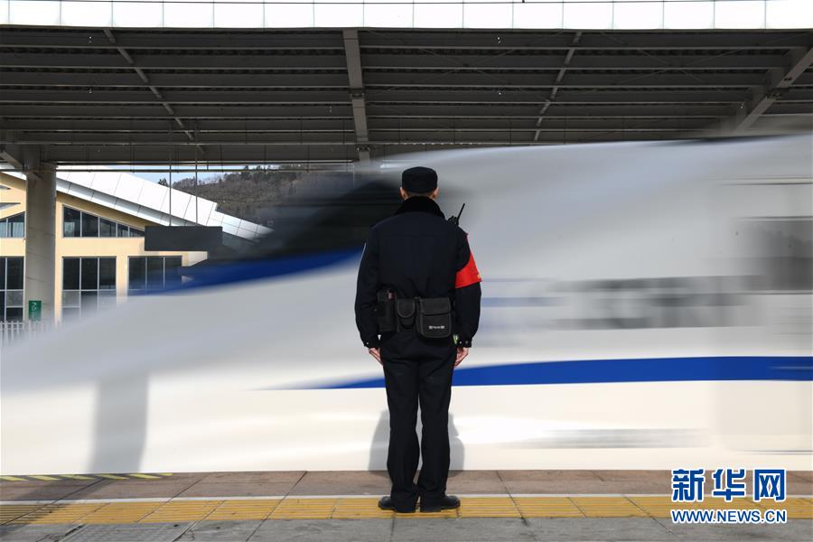 金寨火車站派出所民警張嗣一在站臺接車(12月19日攝)。安徽合肥鐵路公安處金寨火車站派出所位于大別山腹地。在這里,除了所領(lǐng)導(dǎo)外,青年民警平均年齡不到29歲。他們遠(yuǎn)離家鄉(xiāng),扎根大山深處的小站派出所,戰(zhàn)斗在守護(hù)客運(yùn)平安的第一線。新華社記者張端攝