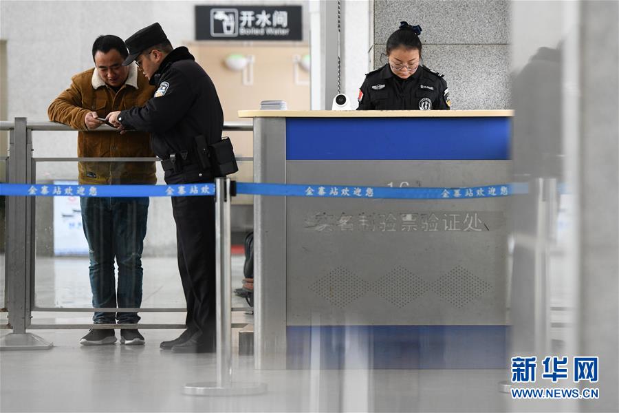 金寨火車站派出所民警劉偉(中)在候車大廳為旅客提供出行咨詢(12月19日攝)。新華社記者張端攝
