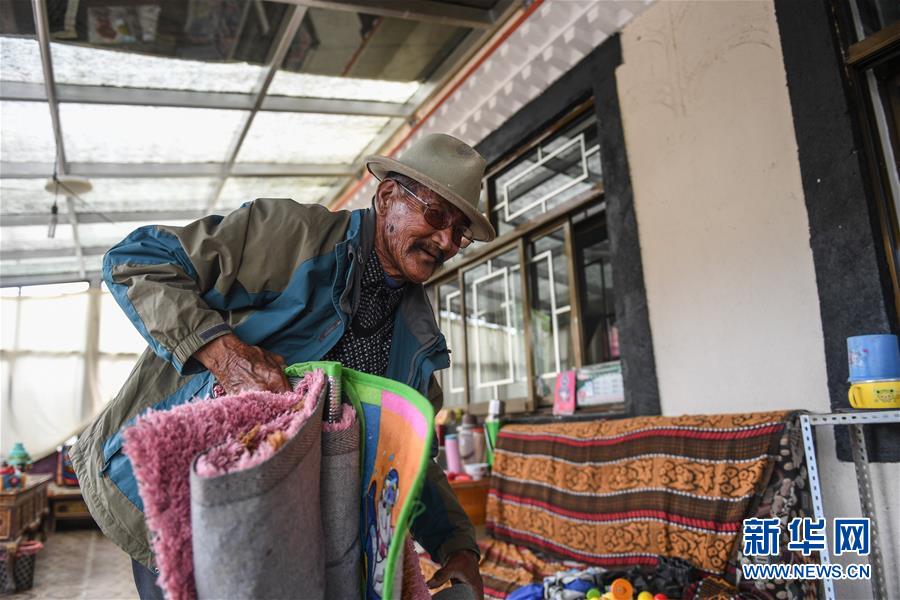 在西藏阿里地區(qū)札達(dá)縣托林鎮(zhèn)札布讓村,76歲的達(dá)瓦次仁在整理家庭旅館的床墊(7月30日攝)。新華社記者晉美多吉攝
