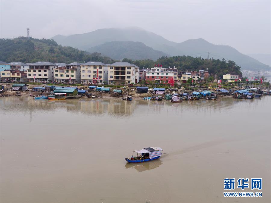 在寧德福安市溪邳村,一艘漁船經(jīng)過岸上新居(3月8日無人機(jī)拍攝)。新華社記者姜克紅攝