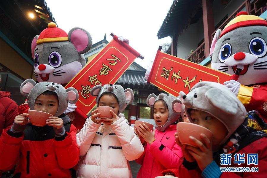 1月2日,小朋友在南京玄奘寺的贈粥送祝?;顒蝇F(xiàn)場喝臘八粥。 當日是農(nóng)歷臘月初八,中國傳統(tǒng)臘八節(jié)。 新華社記者 季春鵬 攝
