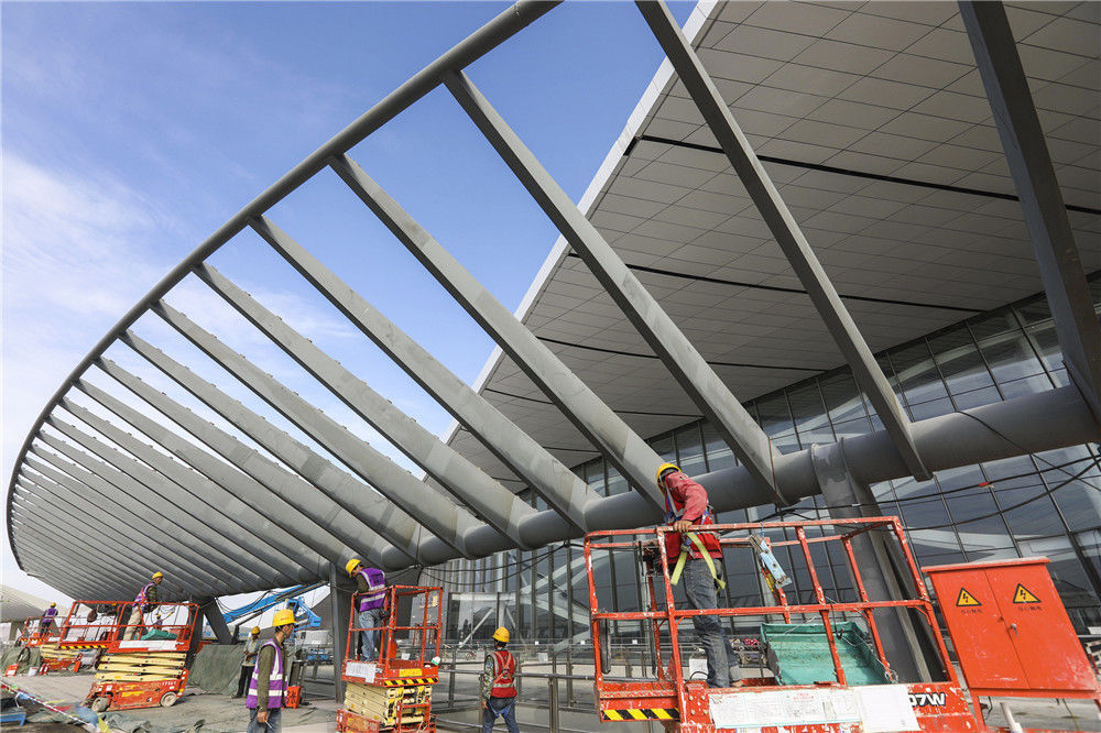 2019年5月24日,北京,新機場建設距離竣工時間還有37天,工程進入倒計時。機場開建至今不到5年時間,機場施工工程將于6月底竣工,將于9月底投入運營,該機場有望成為世界上規(guī)模最大的機場之一。任振朝/千龍圖像/視覺中國