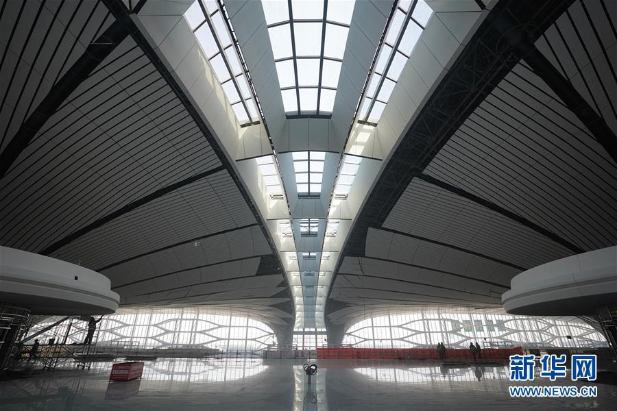 工人在北京大興國(guó)際機(jī)場(chǎng)主航站樓內(nèi)進(jìn)行裝修施工(2018年12月29日攝)。新華社記者鞠煥宗攝