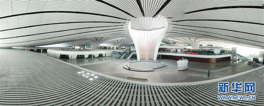 這是6月14日無人機(jī)拍攝的北京大興國際機(jī)場航站樓內(nèi)景(全景拼接照片)。新華社記者才揚攝